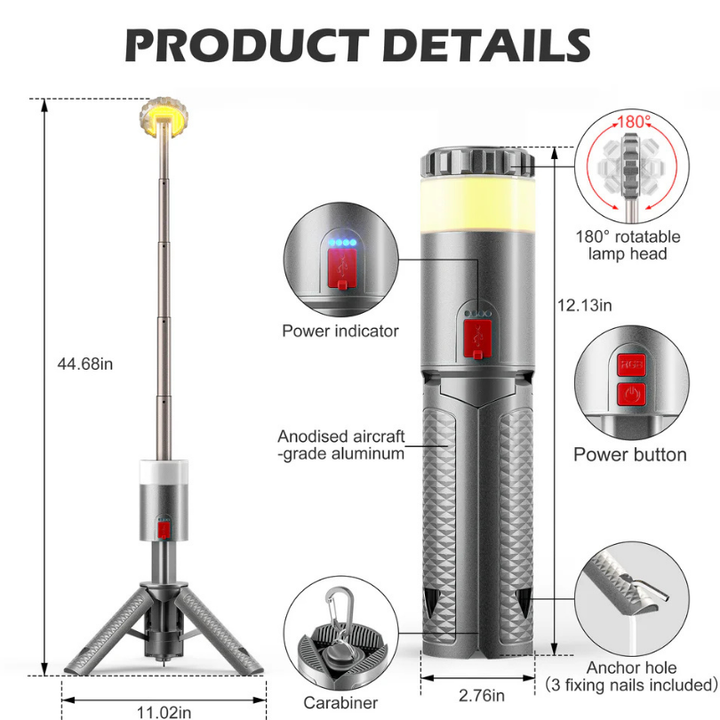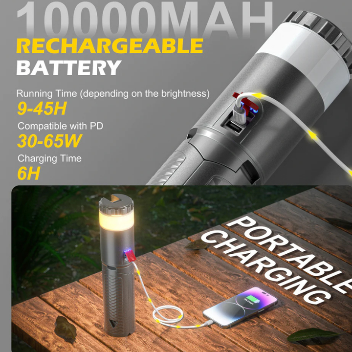 This versatile telescopic camping lantern is a must-have for any outdoor trip. Compact and portable, it works as a flashlight, tent light, or camping lantern. With long-lasting battery life, a single charge keeps it running for hours, so you’ll never worry about running out of power outdoors. Its waterproof design ensures reliable use even in harsh weather. Plus, it doubles as a power bank, letting you charge your phone in emergencies. Perfect for camping, hiking, or unexpected situations, this multifunctional lantern brings light, safety, and convenience to every adventure.
